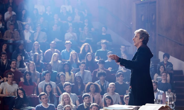 As we rejoined the Doctor (Peter Capaldi), he was working as a university lecturer. Sort of. But this was no corduroy-clad campus drama, so our hero soon teamed up with a nosy dinner lady to be stalked across time and space by a shape-shifting water creature.