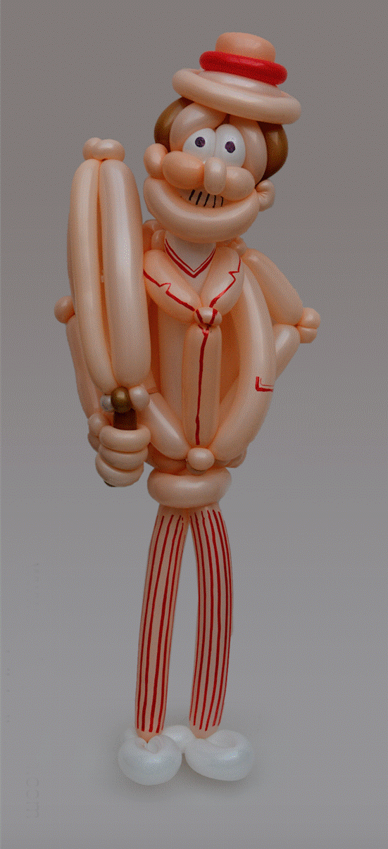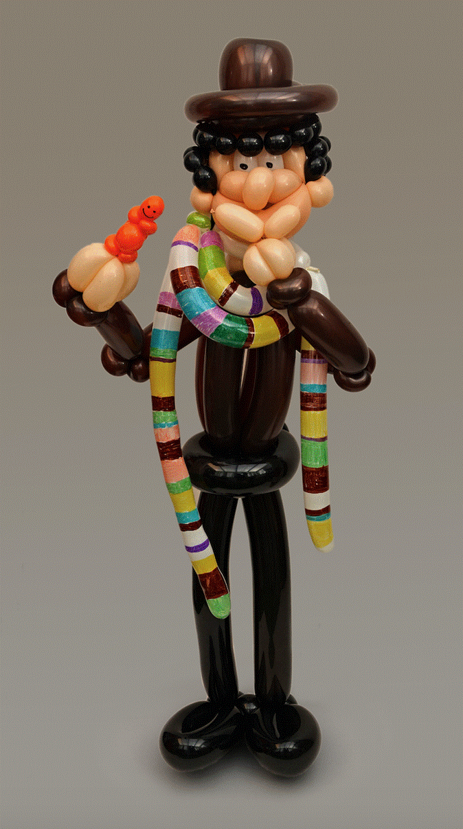 He’s in his cricket gear with his cricket bat over his shoulder. Rob says, “This Doctor took about 20 balloons to make”.